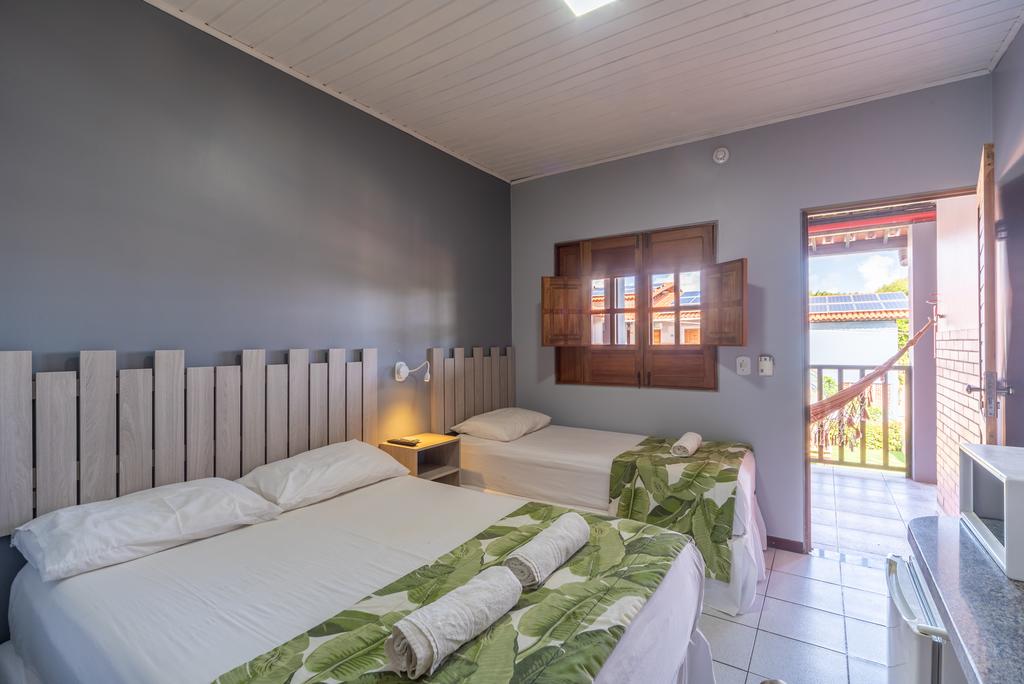 Quarto equipado com ar-condicionado, varanda, rede, TV, frigobar e cofre.